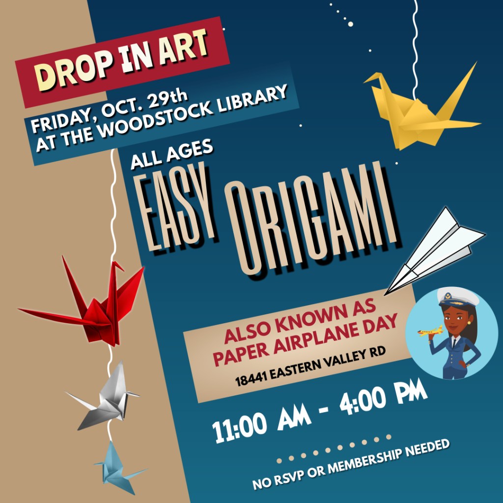 Drop In Art is happening Friday, October 29th from 11:00 AM to 4:00 PM at the Woodstock Community Library!