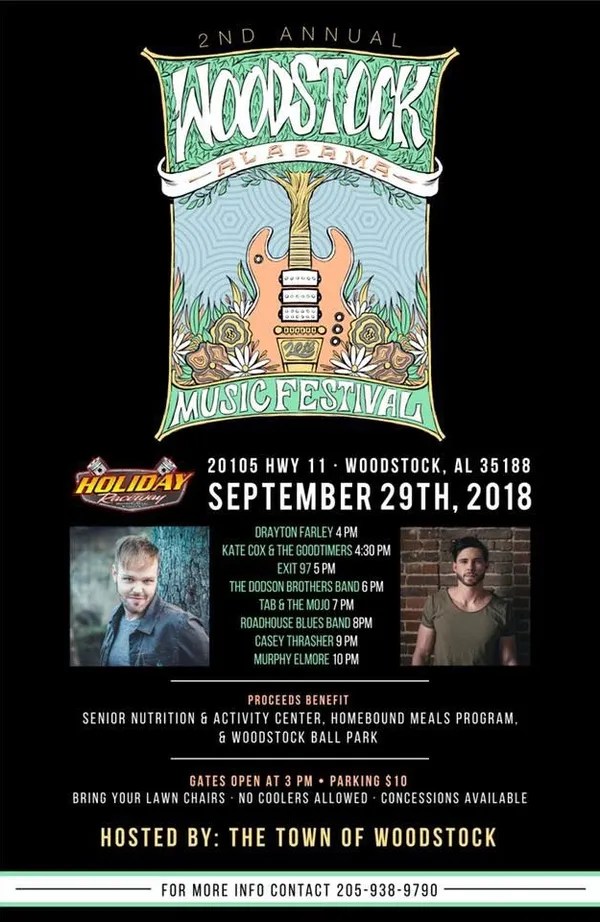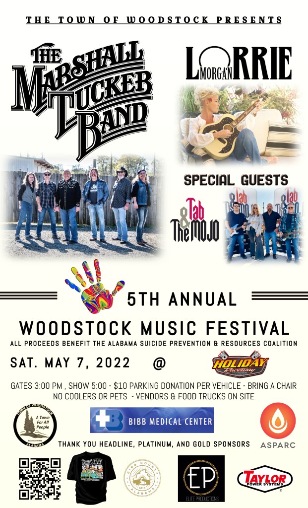 Founded in 2017, the Woodstock, Alabama Music Festival is a highly acclaimed West Alabama music festival that celebrates and showcases both established and emerging artists. The festival creates an immersive experience for music lovers, uniting them through the power of exceptional live performances while raising funds for various nonprofits in Woodstock including the Homebound Meal Program at the Woodstock Senior Center, the Woodstock Community Library, the Woodstock Youth Ballpark, and the suicide prevention efforts of the Alabama Suicide Prevention and Resources Coalition.